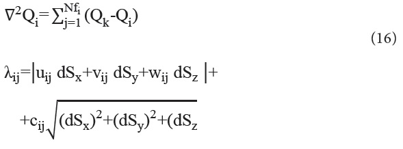 where: subscripts ij denote jth surface of ith finite volume; k denotes the neighbor finite volume across the jth surface of ith finite volume; εij(2) and εij(4) are adaptive coefficients defined as: