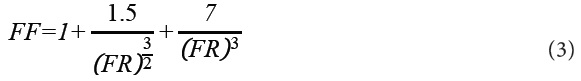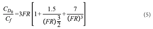 Against the value of FR equal to 4, if we use Eq. 5, then its value is 0.137. This huge digit is due to the fact that Hoerner (1965) had derived the frontal area as reference. Moreover, based on the experimental results and its comparison study, we suggest a correction factor of 1.16 for the FF value obtained by using Eq. 4 and the planform area as reference. It also shows that, in comparison with conventional hull, an airfoil shaped hull will have more drag count.