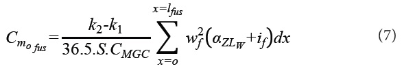 where: k2 – k1 is the correction factor to account for the fuselage slenderness ratio; wf is the average width of the fuselage section, in m; αZLW is the wing zero-lift angle relative to the fuselage reference line, in degrees; Cmα fus is the pitching moment coefficient of the fuselage at zero lift; CMGC is the pitching moment coefficient about the mean geometric chord.