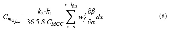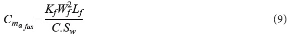 The pitching moment contribution of the fuselage of general aviation aircraft can be approximated by Eq. 9, taken from Raymer (2012). In this relationship as well, the presence of wing can be observed from the factor C and the reference area of the wing (Sw, in m2). Wf is the maximum width of the fuselage, Lf is the length and Kf is the empirical pitching moment coefficient: