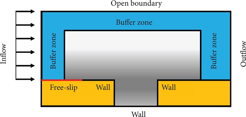 The DNS code was developed by our group for several kinds of problems on hydrodynamic instability and aeroacoustics and was adapted for the open cavity flow (Martínez and Medeiros 2016). It is written in Fortran 90 and, for parallelization, uses both OpenMP and a domain decomposition technique with the 2decomp&fft library (Li and Laizet 2010), which uses MPI. The code uses a structured mesh in a rectangular domain. The grid is much finer in the cavity and close to the flat plate in the wall-normal direction. There is also a lower level of stretching in the stream-wise direction, concentrating nodes on the cavity, and making sure there are nodes positioned exactly on the cavity edges. Closer to the open boundaries, in both directions, the spacing is greatly increased, as part of a buffer zone. No multidomain technique is used in this case, grid points inside the wall are ignored by the solver. Figure 1 illustrates the domain, the buffer zone is shown in blue, while points inside the wall are orange, darker gray levels represent a finer grid.