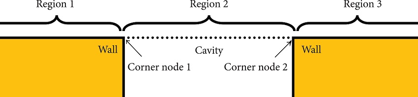 This has solved the problem for both corner nodes and for the Region between them. But nodes in Regions 1 and 3 of the figure would still have its derivatives miscalculated, causing discontinuities in the domain close to the corner, which would later cause the simulation to fail. This was solved by considering both the last node in Region 1 and the first node in Region 3 as inner nodes for the finite differences method, which makes the derivative a continuous function again.