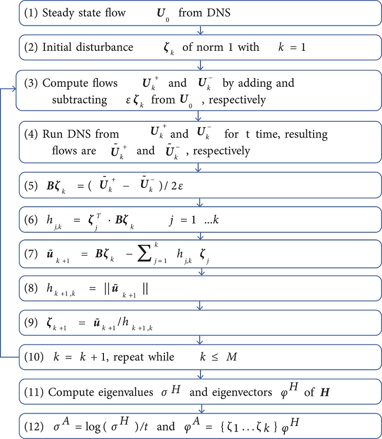 In summary, the method adds small disturbances to the steady-state flow and uses the DNS to observe how the flow reacts to them, as will be described below. After a series of orthogonal disturbances, the Hessenberg matrix from the Arnoldi (1951) method is obtained, which is several orders of magnitude smaller than the flow's Jacobian matrix would be. The eigenvalues and eigenvectors of this matrix are computed and, finally, used to approximate the flow's modes and their respective amplification or attenuation rates. This is shown in the flowchart in Fig. 3.