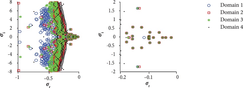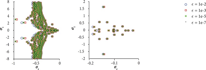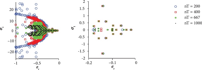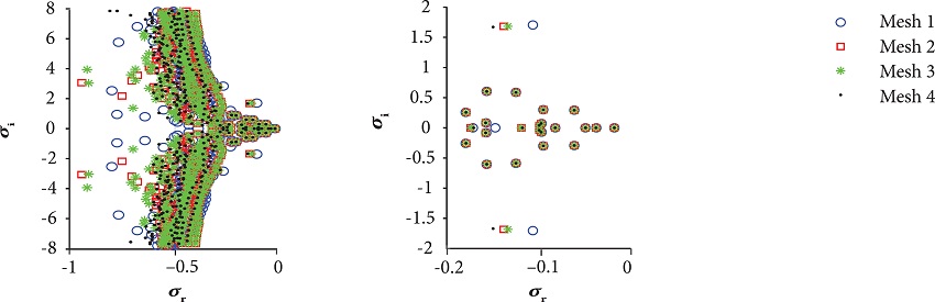 Figure 6 shows the eigenvalues retrieved for these meshes. The right-hand side image depicts the least stable modes in detail.