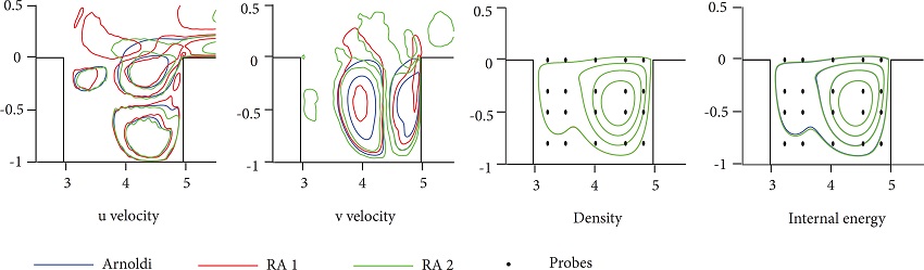 Figure 11 compares the eigenfunctions found by the Arnoldi's method and by the residual algorithm by ploting the eigenmode's isocontours for each variable. Two samples of the RA's eigenfunction are plotted, extracted from different time steps. The probe positions are also shown.