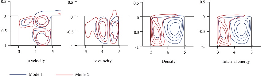 Figures 12 and 13 show some of the modes retrieved. Mesh 2 was used in this run. Figure 12 shows isocontours of each variable in modes 1 and 2. They are both stationary and their eigenvalues are σ1 = -0.01781 and σ2 = -0.03767, meaning they are stable.