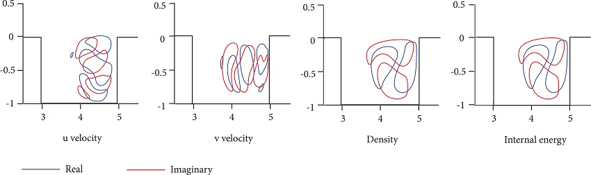 Figure 13 shows mode 4, which is not stationary, therefore has a complex eigenfunction. The isocontours are divided in real and imaginary parts. Its eigenvalue is σ4 = -0.06130 + 0.29274 i.