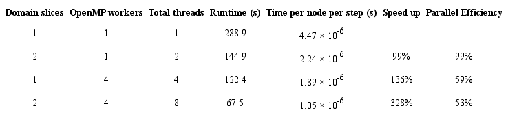 The code was run for 1000 time steps. About 60 MB of RAM were used for the simulation. Table 3 brings the results for different types of parallel execution.