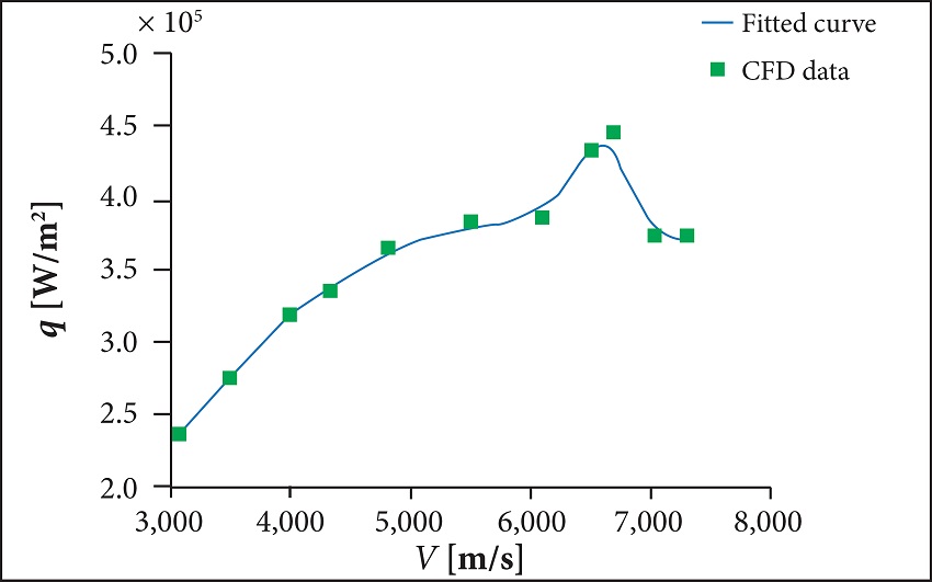 According to a typical re-entry trajectory of Space Shuttle (Sellers 2004), its altitude and velocity profile is shown in Fig. 4. A series of hypersonic flow simulations were conducted from 7,300 to 3,050 m/s through the re-entry stage, where the angle of attack was maintained at 40º. The heat flux variation with velocity at the stagnation point is shown in Fig. 5. Normally, the velocity for the maximum heat flux is about 80 - 85% of the re-entry velocity (Bian and Zhong 1986; Sellers 2004). In this study, the first cosmic velocity is taken as the re-entry velocity. As shown in Fig. 5, the maximum heat flux occurs when the velocity decreases to approximately 6,700 m/s, i.e., roughly 84.8% of the re-entry velocity. Thus, the CFD model used to calculate the heating results at the stagnation point under hypersonic condition is considered to be viable.