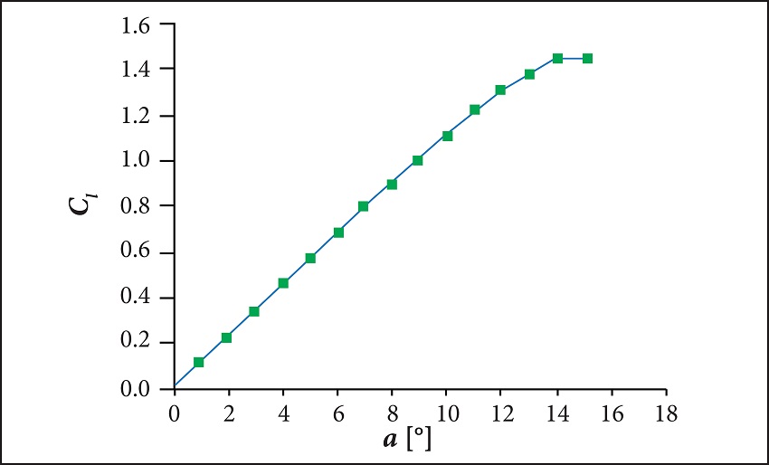 Simulations of aerodynamic characteristics of the NACA 0012 airfoil were carried out at Re = 3.4 × 107 using the previously described computational model. Angles of attack α ranging from 0º to 16º were considered. Figure 6 shows the lift coefficient variation with angle of attack. The slope of the lift curve for an airfoil at high Re can be estimated by the empirical formula (Lu 2009):