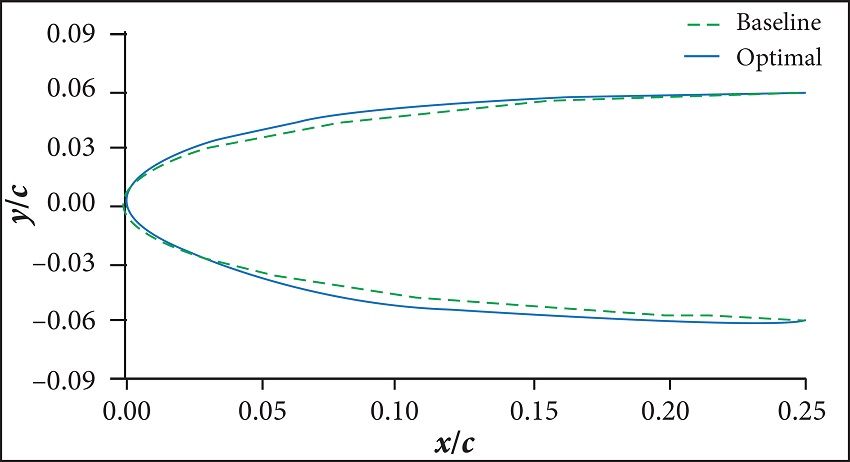 The normalized leading-edge profiles of the baseline and optimal airfoils are illustrated in Fig. 8, where c represents the airfoil chord length. The optimal airfoil is flatter around the stagnation point. Specifically, the radius of curvature at the stagnation point is 0.758 m for the optimal case, while it is 0.690 m for the baseline one. The result is consistent with that of Eq. 1, i.e., the heat flux at the stagnation point is inversely proportional to the square root of the nose radius of the leading edge.