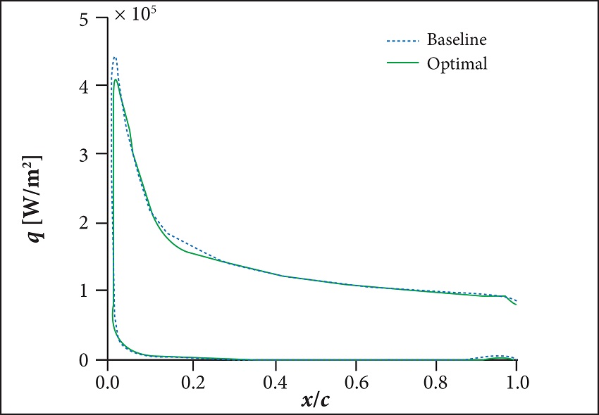 Figure 9 shows the heat flux distribution of the upper and lower surfaces of both airfoils. The maximum heat flux is reduced for the optimal case.