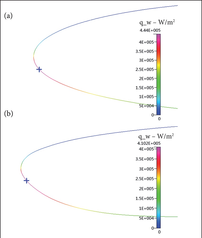 The peak temperature of the outer surface is always close to the radiation equilibrium temperature. The heat flux arising from the aerodynamic braking should not cause the temperature on the ASP surface (Tw) to exceed the maximum permissible values for materials placed on the outer surface. As for the stagnation point,