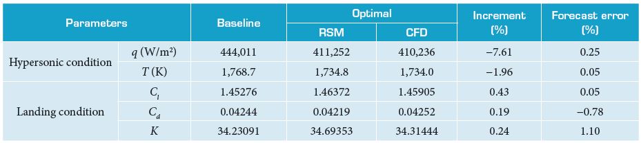 Isight was used to integrate MATLAB® code, CFD-GEOM as well as CFD-FASTRAN to conduct DOE and the optimization process. First, 150 sample points were selected using LHS to conduct CFD analyses for both hypersonic and landing conditions, and the design space is: a1, a5, a6, a10 are among [−0.01, 0.01], while a2 ~ a4 and a7 ~ a9 are among [−0.02, 0.02]. Then, RSM surrogate models were constructed for both objective and constraint functions. Another 20 random points were used to evaluate the accuracy of the surrogate model. Details are shown in Table 2, where RMSE stands for root mean square error. It is shown that the approximations for heat flux and lift-to-drag ratio are of high quality.