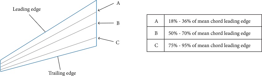 Figure 3 shows a description of the location on the NACA 4412 half-span tapered wing. First, the location (A) is taken at 18% to 36% of mean chord (c) from the leading edge (LE) based on the maximum thickness of airfoil, which is 20% of the mean chord (c). Secondly, the location (B), 50% to 70% of mean chord from leading edge, is taken from bird wing of and Eagle, which has major distribution of roughness at 50% to 70% of mean chord from the leading edge. And finally, location (C), 75% to 95% of the mean chord from leading edge, is taken after Chakroun et al. (2004), who showed highest lift coefficient up to stall angle at 25% of the airfoil surface and located at the trailing edge (TE).
