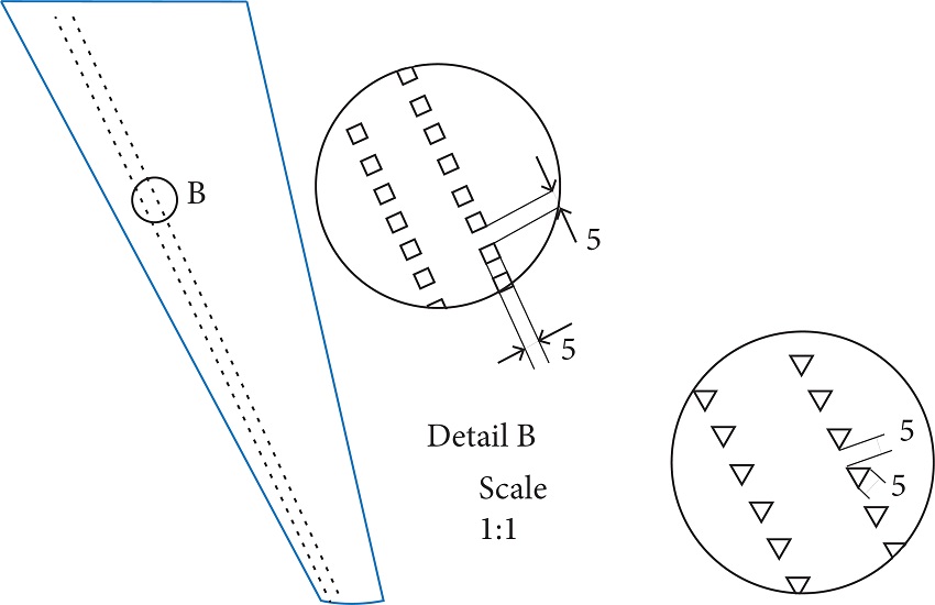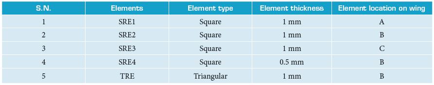 For square roughness element (SRE) of 1 mm thickness, the same three locations A, B and C mentioned earlier were chosen for investigation. This location B was found to be major contributor in the effect on aerodynamic loads. Further a 0.5 mm thick square and a 1 mm thick equal triangular roughness element were investigated at location B. The center-to-center distance between the two elements is 10 mm. Size of all (SREs and TRE) is 5 mm. Table 3 shows the description of SREs and TRE. Figure 4 shows SREs and TRE installation arrangement on wing.