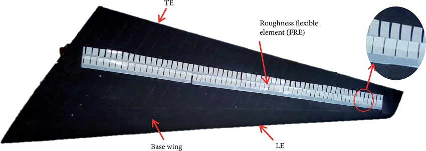 The flexible roughness element (FRE) is described in Table 4. The flexible element shape is rectangular and is free to rotate about its transverse end during the test. One end of this flexible rectangular element is fixed on the wing surface by double-sided adhesive tape (see Fig. 5). For FRE, PVC opaque white sheet with 1GPa modulus of elasticity was used to manufacture the elements. This has 0.4 mm thickness and 20 × 14 mm size; the elements are spaced 5 mm apart. Both FREs are same except their different location on the wing, 0.5 c to 0.7 c and 0.7 c to 0.9 c of mean chord from LE mean upper side for FRE1 and FRE2, respectively.