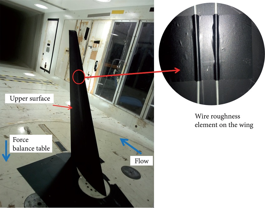 All experiments have been carried out in the IIUM low speed closed loop wind tunnel located in the Mechanical Engineering Department of International Islamic University of Malaysia, which has a test section of 2.3 × 1.5 × 6 m with optically transparent walls. The maximum airspeed in the wind tunnel is 50 m/s and the turbulence intensity of flow is < 0.11%. Tests were performed at a free stream speed from 20 m/s. A six-component balance was used to measure the forces and moments. The half model normal force has a measurement range of ±2000 N and the uncertainty of 0.0406% FS. The axial force has a measurement range of ±700 N and the uncertainty of 0.04975% FS. The pitching moment has a measurement range of ±250 N.m and the uncertainty of 0.04143% FS. The maximum blockage ratio is 4.7%, which is less than 5%. Figure 6 shows a NACA 4412 half-span taper wing installed in the IIUM wind tunnel.