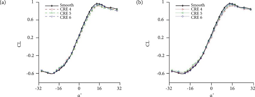 Figure 7b shows CL variation for CRE4, CRE5, and CRE6 for different locations (A, B and C). Smooth wing has a higher CL value compared to these roughness elements. The stall angle was delayed by 4º for CRE4 and CRE5 cases at 18º. There was no stall angle change for the CRE6 case. The highest lift coefficients are 0.9274, 0.94, and 0.9509 for CRE4, CRE5, and CRE6, respectively.