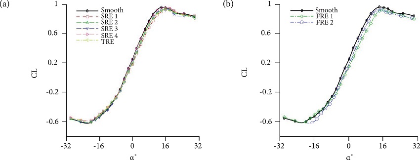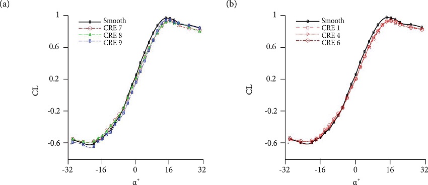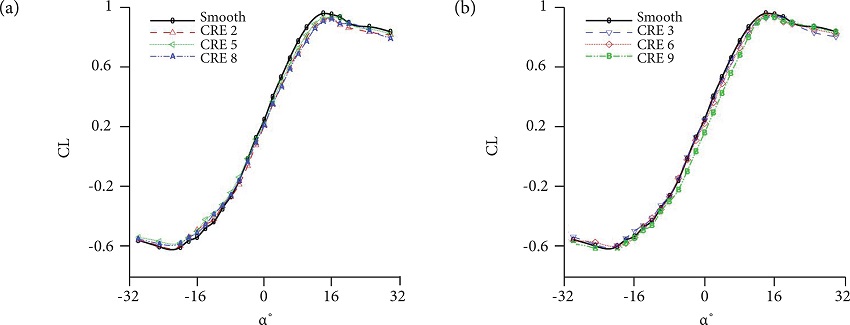 The variation of CL for CRE7, CRE8, and CRE9 cases is shown in Fig. 8a. The stall angle was delayed by 2º for CRE7, CRE8, and CRE9 cases. The maximum lift coefficients were found around 0.9408, 0.9311 and 0.9409 at 16º angle of attack for CRE7, CRE8 and CRE9 rigid roughness elements.