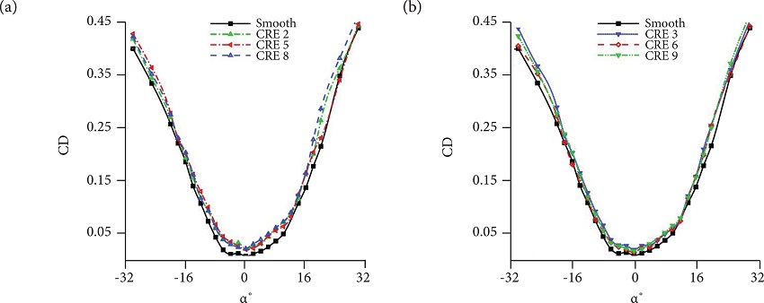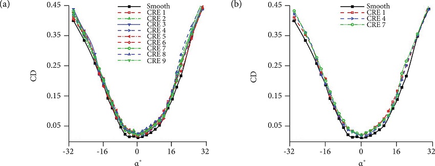 As shown in Fig. 11a, the minimum value of drag coefficient (CDmin) for the smooth wing is found to be around 0.011. The drag coefficient of wing with wire roughness elements for 0.5 mm size (for CRE1, CRE2 and CRE3), 1 mm size (for CRE4, CRE5 and CRE6), and 2 mm size (for CRE7, CRE8 and CRE9), increases for all angle of attack as compared to the smooth wing. For CRE1, CRE2 and CRE3, the CDmin is slightly higher than the CDmin for the smooth wing for all positive and negative angles of attack. The value of CDmin at zero angles of attack is 0.0191, 0.0239 and 0.0169, compared to the smooth wing element, there is an increase in minimum drag coefficient of 73.9%, 115.3%, and 52.3%. The CDmin for CRE4, CRE5 and CRE5, are 0.0228, 0.0252, and 0.0196, respectively; therefore, CDmin is increased by 105.4%, 127%, and 76.6%, respectively. For CRE7, CRE8 and CRE9, the CDmin are 0.0222, 0.0244 and 0.022, respectively; therefore, CDmin is increased by 100 %, 119.8%, and 98.2%, respectively.