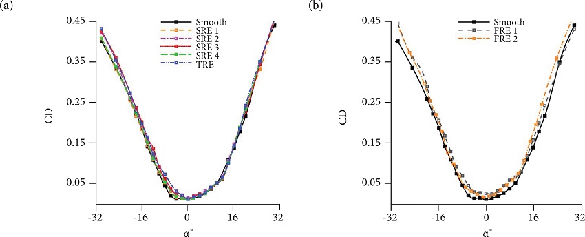 Figure 13a shows the CDmin for SRE1, SRE2, SRE3, and SRE4 are found to be around 0.015, 0.015, 0.014, and 0.011, respectively; therefore, CDmin for SRE1, SRE2, SRE3, and SRE4 roughness elements is increased by 37%, 31%, 25% and 2%, respectively. For TRE roughness cases, the CDmin value is 0.0142, which has an increment of 28% compared to smooth. In cases of FRE1 and FRE2, the CDmin is 0.0279 and 0.0183 at zero angles of attack (see Fig. 13b), which shows a 151.4% and 64% rise in the CDmin compared to smooth wing element.