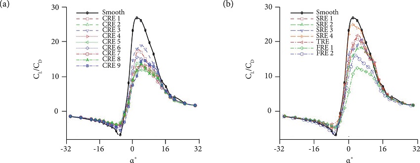 Lift to drag ratio (L/D) is one of the most important parameters affecting wing aerodynamic performance. The lift to drag ratio curve gives the optimum value of α for different wings. As shown in Fig. 14, the smooth wing shows the highest lift to drag ratio, (L/D)max, smooth = 26.85 at an angle of attack 2º.