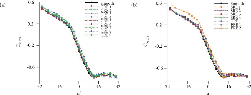 The CMc/4 graph results for all rigid roughness elements suggest that there is a small increment in the magnitude of the pitching moment as compared to the clean smooth wing. The slopes do not change. SRE1 and CRE9 roughness elements show higher CMc/4 compared to the other tested roughness elements. The effect of surface roughness element CRE3 on CMc/4 curve shows the smallest effect compared to the other elements. A negative value of CMc/4 at zero angle of attack is observed for all tested elements.