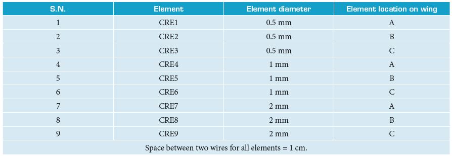 In this case, the role of cylindrical (wire) shape is examined by varying the cylindrical diameter at three different locations on the wing. The cylindrical roughness elements (CRE) have three different sizes in diameter of wires, which are 0.5, 1 and 2 mm, to analyze their effect on the NACA 4412 tapered wing. The length of the wire is approximately the same as the base wing. The two wires were fixed to the wing surface using double-sided adhesive tape and super glue to prevent any movement of the wires during testing in the wind tunnel. A black tape was used on both wires for providing enough strength during testing for wind tunnel. This roughness element was proposed by Chakroun et al. (2004), who studied wire elements with 2 mm diameter and 1 cm spacing on a symmetrical NACA 0012 airfoil. The detailed characteristics and dimensions of each type cylindrical roughness elements are given in Table 2.