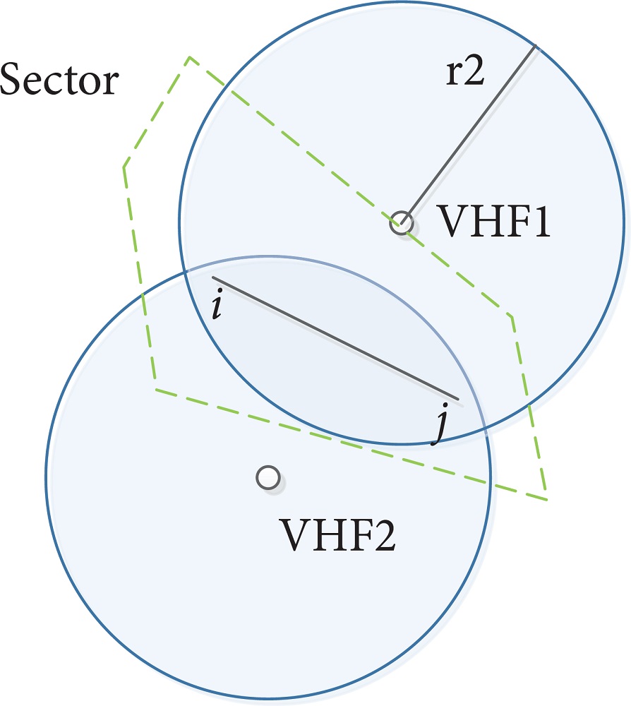Similar to PSR/SSR, a single route may be covered by multiple VHF signals. And the reliability can be used to represent the weight of VHF. As it is shown in Fig. 2, the route in the sector is supported by VHF1 and VHF2. The support range of VHF is r2. The total reliability on the route between nodes i and j can be expressed as (Eq. 8):