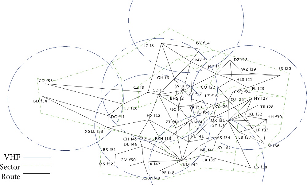 It was used the model construction principle mentioned before to construct the ATMTSS network model in Southwest China. The region has 56 nodes, 9 route radar control systems, 7 route VHF communication systems, and 17 sectors. There are 14 sectors left after merging the sectors with different levels of elevation in the same places. The initial non-weighted topology network is shown in Fig. 3. In order to obtain the weighted ATMTSS network model, the network edge should be weighted according to the equipment support capability. When assigning weights to edges in the network, the coverage of PSR/SSR and VHF in this area should be confirmed, as shown in Fig. 4 and Fig. 5. According to the coverage of the devices and the distance of the routes, weighted network is obtained.