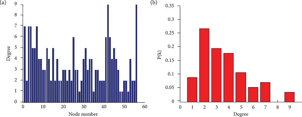 where eij is the route between nodes i and j. The degree distribution in the network is expressed by the distribution function p(k), which describes the probability that the degree of an arbitrary choice of nodes happens to be k . If the degree distribution of a network satisfies the power law distribution, the network has a random feature.