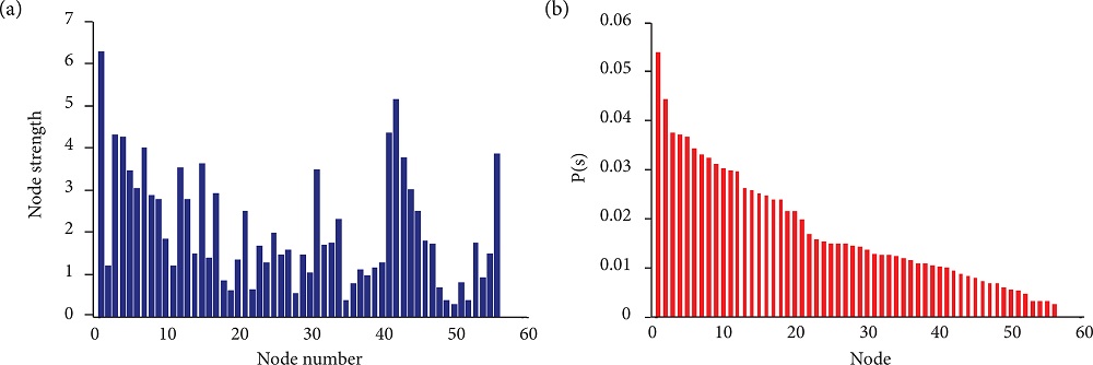 Table 1 shows that there are 56 nodes in this network and each point is connected to 3.6 points on average. This is consistent with the degree distribution. Moreover, the clustering coefficient of ATMTSS network is low, while the weighted clustering coefficient is even lower. The reasons are that ATMTSS devices need to be evenly distributed to ensure the balance of air traffic development and the air traffic security in Southwest China. In addition, the average path shows that an aircraft needs to go through 3.7786 edges to reach another node, while the network diameter is 9; the reason is that the ATMTSS network is a complex network with small-world characteristic.