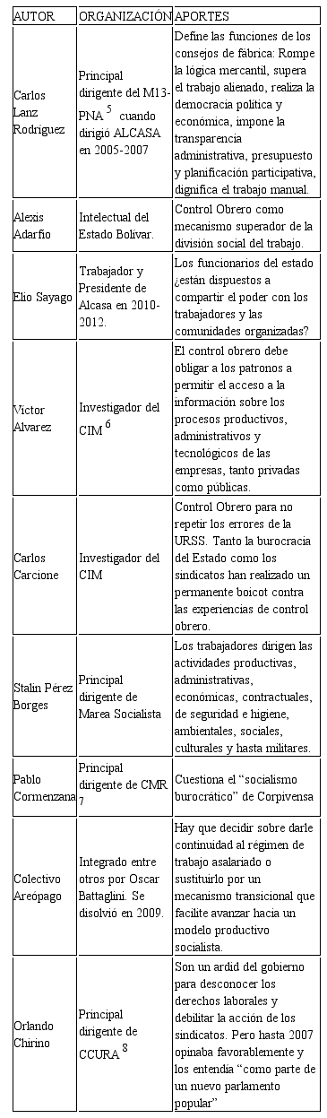 En el campo de la oposición a Chávez, dirigentes como Orlando Chirino denunciaron la figura de los Consejos de Trabajadores como un ardid del gobierno para desconocer los derechos laborales y debilitar la acción de los sindicatos. Pero hasta 2007, el mismo dirigente opinaba favorablemente hacia estos consejos laborales, y los entendía “como parte de un nuevo parlamento popular”, junto a otras formas de organización similares como los Consejos Comunales (Chirino, 2007).