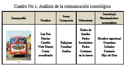 De tal manera que, la yuxtaposición de imágenes iconográficas en la superficie del bus, (Foto No.1. Las Dos Marías-Castillo Walt Disney-Cristo crucificado) se constituye en comunicación iconológica que transmite la realidad íntima de ser –Padre de familia-Padre bondadoso- cristiano-Padre en la tierra-. Con respecto a lo anterior, se plantea que la metáfora hallada en el bus es un producto cultural que surge de la mediación entre la realidad objetivada y la experiencia íntima del sujeto que se aventura a comunicar su yo-íntimo; “es una comunicación (Iconológica) con el otro y consigo mismo; en términos metafóricos una conversa en voz alta que es escuchada por muchos” (Hernández; 2013: 46). Este yo-sujeto es una entidad simbólica que proyecta al mundo su corporeidad singular, en tanto es sujeto enunciante, y a su vez representa la cultura que le ha preñado de sus marcas identitarias, las que el sujeto íntimo reconfigura.