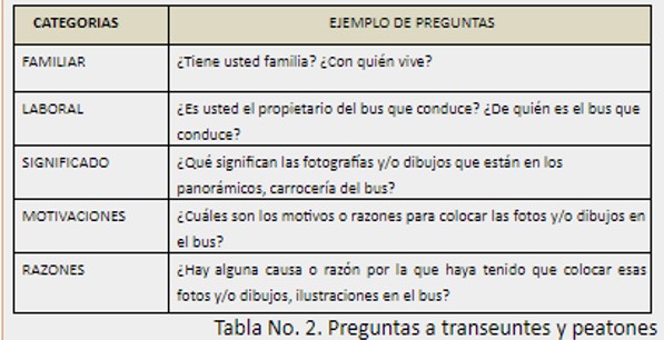 Se escogieron, dentro de un parque automotor de aproximadamente 4512 buses (Secretaria de Movilidad de Barranquilla. Inf. Técnico a Sept/2016) y un universo poblacional de más de 500 iconografías de los buses que transitan por las avenidas, una muestra conformada por 15 iconografías exteriores e interiores. La metodología consistió en observar y fotografiar desde diversos puntos de la ciudad, a estos buses y sus iconografías y llevar a cabo una entrevista semiestructurada a cada uno de sus conductores y/o propietarios. Se le hicieron preguntas a 30 personas, (transeúntes, vendedores ambulantes y peatones) en las calles. Los temas o categorías para formular la entrevista a los conductores y las preguntas a los peatones son: