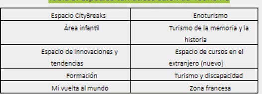 Las ediciones del salón se celebran durante un total de 4 días. En sus instalaciones atienden a diez espacios temáticos diferentes, desde escapadas de menor duración (City Breaks) a un espacio para niños o para bloggers viajeros (mi vuelta al mundo) (Tabla 5).