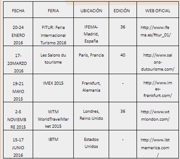 Así pues, se analizarán las ferias internacionales de turismo celebradas en 2015 en Madrid (FITUR), París (Salón Mundial du tourisme), Frankfurt (IMEX), Chicago (IBT) y Londres (WTM). En el análisis se propone alcanzar los siguientes objetivos: