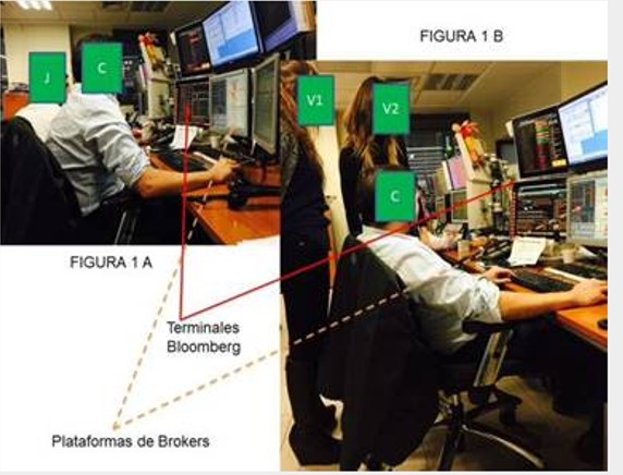 En la figura 1, dos traders sales (V1 y V2) se encuentran mirando directamente a la pantalla Bloomberg de C, quien es el trader encargado de un área de market making. En dicho sentido, la plataforma Bloomberg se puede entender como un elemento mediador de conversaciones y sobre las controversias en el mercado entre quienes ven los flujos (V1 y V2) y quienes toman las posiciones: C en la figura 1B y J en la figura 1A. El terminal Bloomberg es ciertamente un objeto mediador que permite centrar la cognición distribuida de la mesa. Aún más, en la figura 1A se muestra que dicho terminal —y en gran medida las plataformas de brokers— son un objeto que media en el trabajo, siendo parte fundamental de las discusiones y el hacer sentido común entre traders market makers.