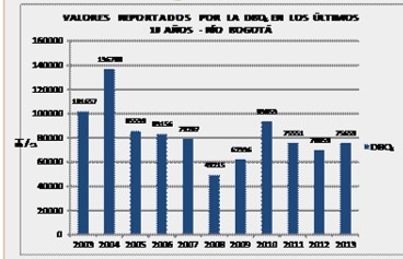 Como un ejemplo de lo que actualmente sucede con la contaminación ambiental a nivel nacional se presenta la Gráfica1, donde se evidencian las cantidades de materia orgánica que se han presentado en el río Bogotá en los últimos diez años, teniendo en cuenta lo reportado por la DBO5.
