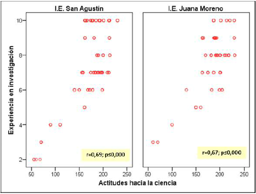 Concerniente a la relación entre las actitudes hacia la ciencia y la experiencia investigativa, en la I.E. San Agustín registró un coeficiente de correlación de Pearson de 0,69 y una p≤0,000, encontrando significancia estadística y se concluye que estas dos variables están correlacionadas positivamente. Y, asimismo, en la I.E. Juana Moreno el coeficiente de correlación de Pearson fue de 0,67 y una p≤0,000, encontrando significancia estadística y se concluye que estas dos variables también están correlacionadas positivamente (Figura1).