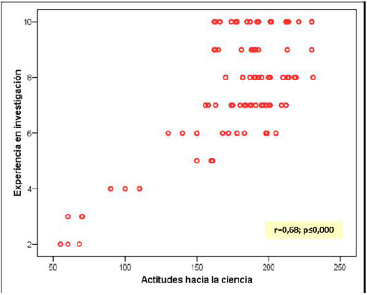 Y, general, respecto a la relación entre las actitudes hacia la ciencia y la experiencia investigativa, se obtuvo un coeficiente de correlación de Pearson de 0,68 y una p≤0,000, denotando significancia estadística y se concluye que estas dos variables están correlacionadas positivamente (Figura 2).