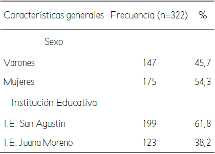 Dentro de las características generales tenemos: el 54,3% (175 estudiantes) fueron de sexo femenino y el 45,7% (147 estudiantes) pertenecieron al sexo masculino. Por otro lado, el 61,8% (199 estudiantes) correspondieron a la Institución Educativa San Agustín y el 38,2% (123 estudiantes) a la Institución Educativa Juana Moreno (Tabla 1).