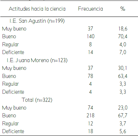 Respecto a las actitudes hacia la ciencia, en la I.E. San Agustín, una gran proporción de estudiantes del 70,4% manifestaron una actitud buena, el 18,6% muy buena, sin embargo el 7,0% y 4,0% las actitudes fueron deficiente y regular, respectivamente. Asimismo, en la I.E. Juana Moreno, el 63,4% (78 estudiantes) declararon una actitud buena, el 30,1% muy buena y el 3,3% de regular y deficiente, cada una. Y, en general, gran parte de ellos del 67,7% proclaman una actitud buena (Tabla 2).
