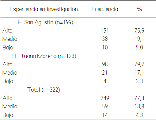 En relación a la experiencia investigativa, en la I.E. San Agustín, un elevado porcentaje de estudiantes del 75,9% tuvieron experiencia investigativa alta, el 19,1% media y en cambio el 5,0% la experiencia fue baja. Por su lado, en la I.E. Juana Moreno, también el 79,7% (98 estudiantes) presentaron experiencia investigativa alta, el 17,1% media y el 3,3% baja. Y, en general, la mayoría del 77,3% sostuvo una experiencia en investigación alta (Tabla 3).