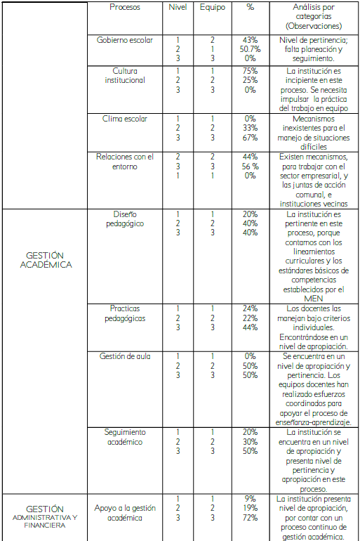Existencia, que corresponde al nivel 1 del cuestionario, indicando que la institución se caracteriza por un desarrollo incipiente, parcial o desordenado, según el caso. Ello se traduce, de acuerdo con los criterios de la Guía 34, que no hay planeación ni metas establecidas y las acciones se realizan de manera desarticulada. Pertinencia, le corresponde el nivel 2 del mismo cuestionario, e indica que están presentes en la gestión educativa principios de planeación y articulación de los esfuerzos y acciones del establecimiento para cumplir con sus metas y objetivos. Apropiación, le corresponde el nivel 3, y señala que las acciones realizadas por el establecimiento tienen un mayor grado de articulación que los anteriores estratos, siendo aquellas conocidas por la comunidad educativa; sin embargo, todavía no se realiza un proceso sistemático de evaluación y mejoramiento. Valoración de Mejoramiento continuo, le corresponde el nivel 4, es decir, el establecimiento involucra la lógica del mejoramiento continuo: evalúa sus procesos y resultados y, en consecuencia, los ajusta y mejora. Sin embargo, este último nivel es el norte de la institución, lo cual significa que los resultados obtenidos de los niveles anteriores sirven de soporte para lograr el mejoramiento de las debilidades y el afianzamiento de las fortalezas institucionales. Por ello, todos los aspectos que involucran la autoevaluación se evidencian en los resultados presentados en la Tabla 1, salvo el Nivel 4, el cual será evidenciado con posterioridad a través de los logros institucionales que se alcancen luego de la investigación.