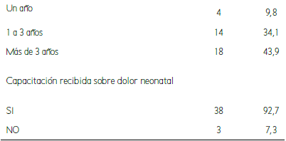 En cuanto a las características generales consideramos a la edad, donde el 43,9% (18 enfermeras) presentaron edades entre 41 a 50 años, por otro lado, el 43,9% (18 enfermeras) tuvieron tiempo laboral mayor de 3 años y la mayoría del 92,7% (38 enfermeras) afirmaron capacitación sobre dolor neonatal (Tabla 1).