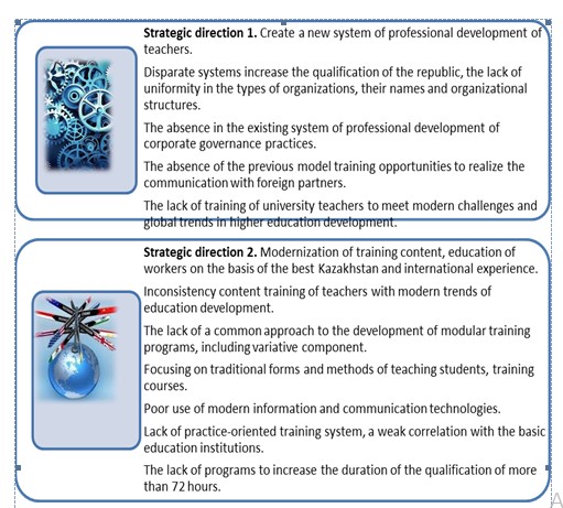 organizations. All that is offered in the classroom, to digest (or vice versa is not absorbed), in accordance with the direction, motivation of students. Consequently, the learning process cannot be guided by the final consumer of educational services - listener’s refresher courses. All of the surveyed respondents agree that the use of innovative technologies in the system of training influences the degree of satisfaction of teachers enrolled in courses with various aspects of the course of preparation, as well as on the effectiveness of educational institution services (The high mission of "Orleu2013, p. 63-64). As a result of research, we came to the conclusion that the Kazakh system of professional becomes the center of the innovation movement. With the support of the state to build capacity and accumulated considerable potential for the formation of the new competences of the higher school and goes to a new paradigm of activity - scientific and methodological and personnel support of education through scientific and methodical and staffing component of developmental education.