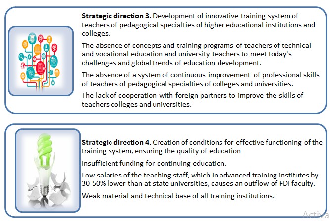 Concluding the analysis of the current situation in the field of training of the teachers analyze the activities and training institutes in the country. The State Program of Development of Education of the Republic of Kazakhstan for 2011-2020 states that each year must undergo training