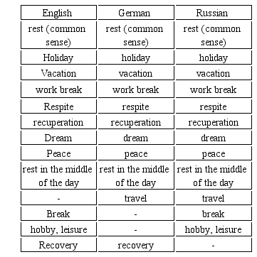 The results of comparative analysis of lexical and semantic representation of rest as a universal value should be presented in the form of a table.